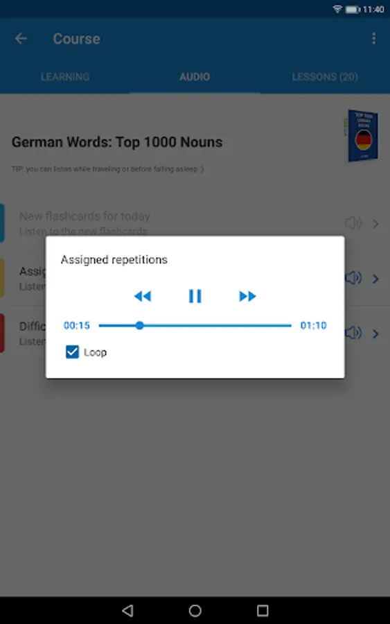 Why are our German flashcards special? The secret is in the combination of more elements that help you learn: the image, the German pronunciation, examples of sentences, definitions and hints, that explain the meaning of a word and show how can you use it in day-to-day life. Our method combines audio and visual memory to help remember forever. Also, we have created a Repetition System that reminds you the needed words at the right time, so you will not feel the need of dictionaries and subtitles anymore!