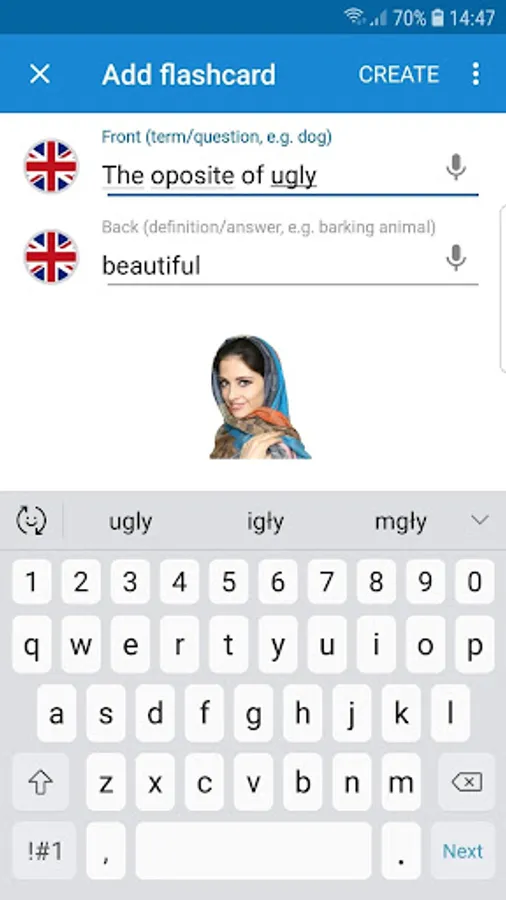 All you need is to type a word! We will do the rest! The image and sentence will be generated automatically by the system. You will be able to add this (with pronunciation and exemplar usage) to your own flashcards.