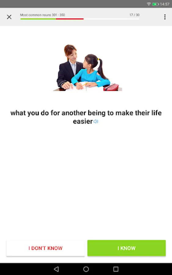 Why are our flashcards special? The secret is in the combination of more elements that help you learn: the image, the pronunciation, examples of English sentences, definitions and hints, that explain the meaning of a word and show how can you use it in day-to-day life. Our method combines audio and visual memory to help remember forever. Also, we have created a Repetition System that reminds you the needed words at the right time, so you will not feel the need of dictionaries and subtitles anymore!
