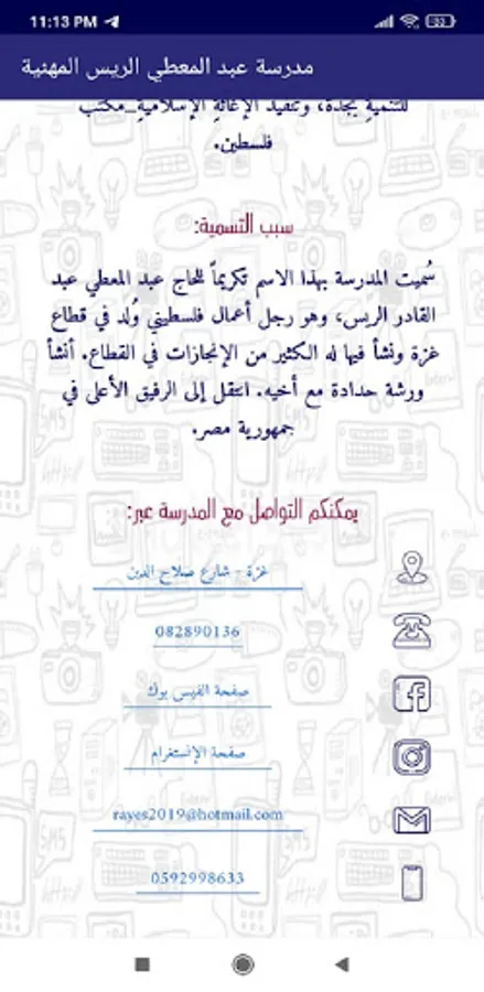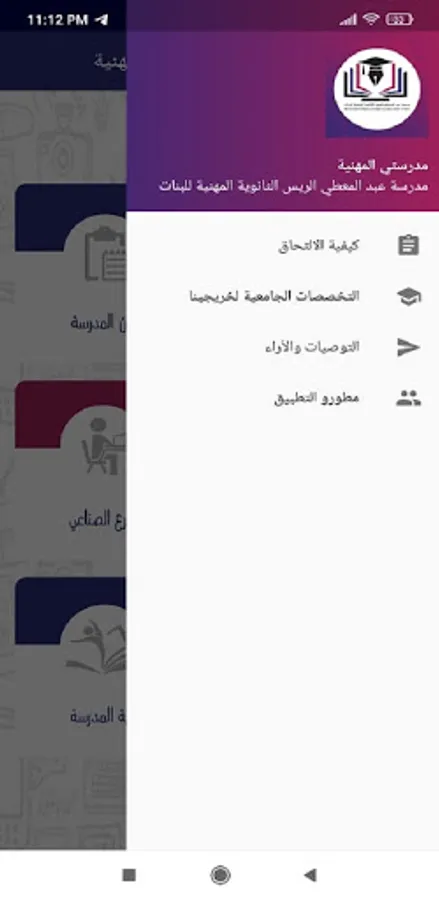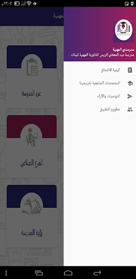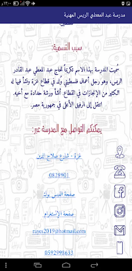 This application is produced by students specializing in smart phone applications (Doaa Shabana - Tujan Al-Aklouk - Raneem Abu Ras) at Abdul Mu'ti Al-Rayyes Vocational School for Girls, and the application is known for the school's specializations and vocational education in addition to presenting some of the students' work in each specialty, the school's activities, and the vision And the school's goals and terms of joining the school, and it helps to communicate with the school directly through social media sites and school phone numbers.