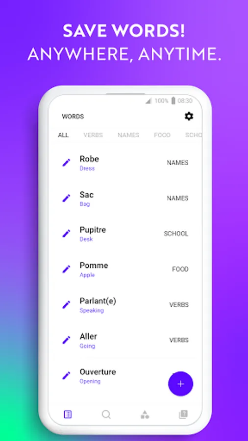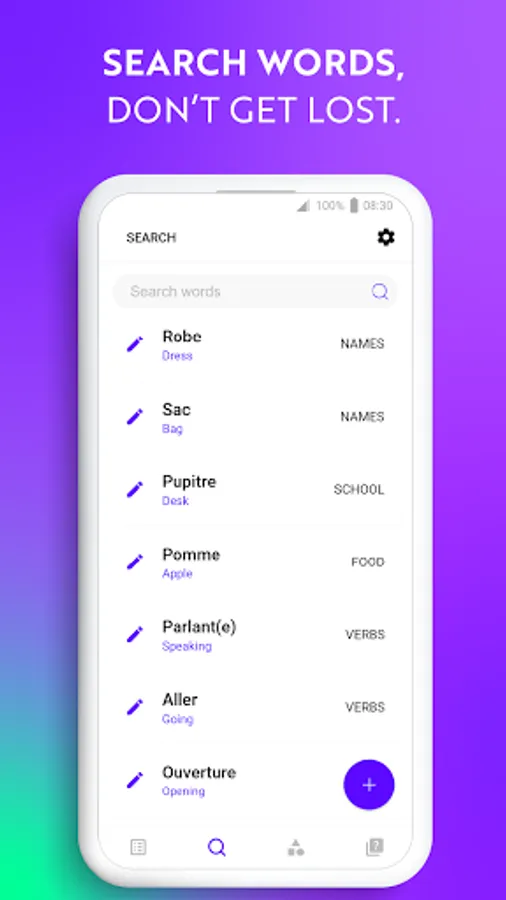 ** On the home screen, you can see the list of the category you have previously created and the words associated with it. When you want to add new words to these categories, you can click the button in the lower right corner and add the word you want to add with its meaning.