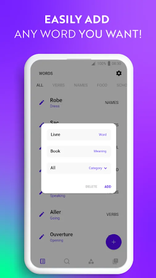 You can provide faster learning by categorizing the thousands of words you will add, making studies on the basis of categories, or you can enrich your work with the category of all by taking the categories as a whole.