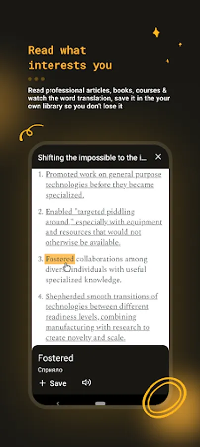 Learn languages by read in English the content you love with our parallel-text method geared for every experience level - from beginner to expert! Read articles and web pages in foreign language and see the translation of the words with easy tap. Save unknown words to build your language vocabulary. Learning languages is fun with read-along interesting articlea!