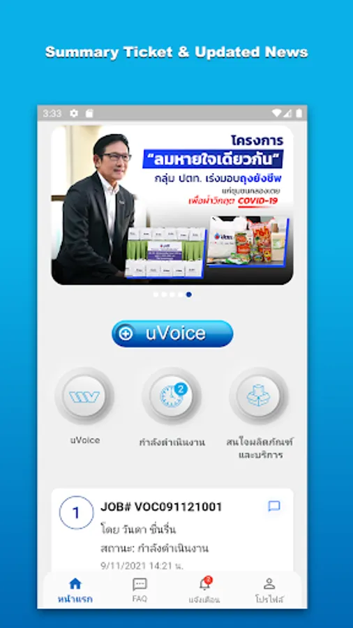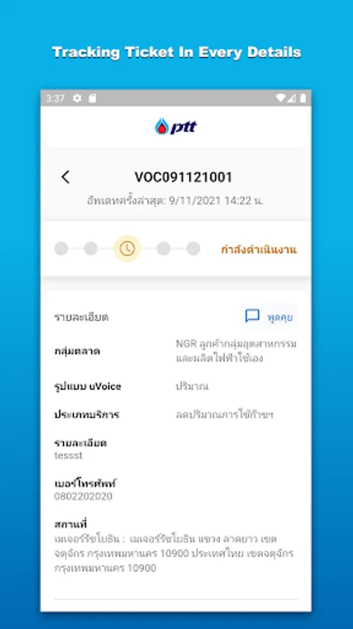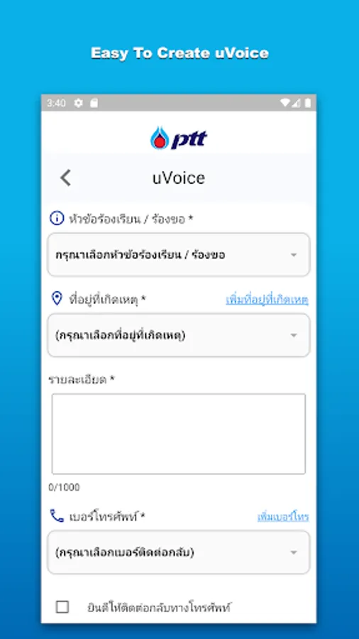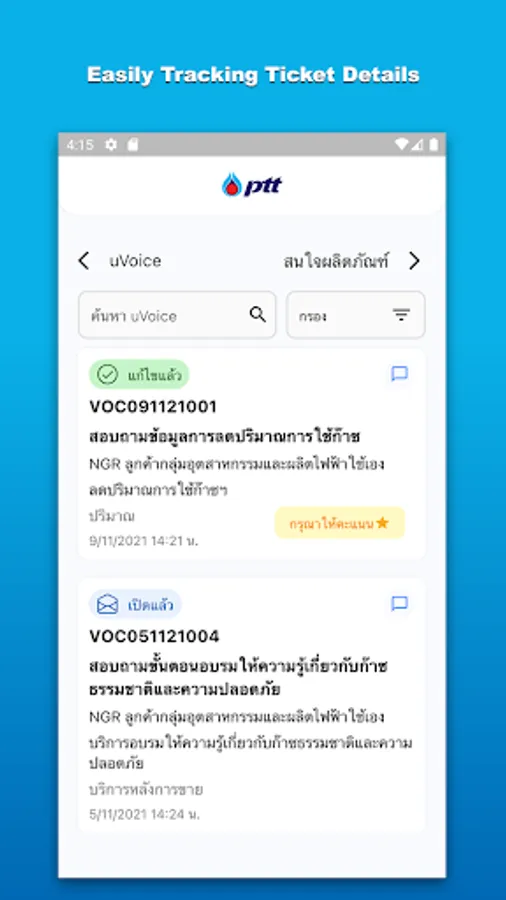 ‘uVoice’ is a new application to get customer feedback for PTT Public Company Limited. A new easy-to-use and fastest way to report any problems for customer of our company. Customers under Natural Gas Supply and distribution business, Gas Separation Plants (GSPs) business, Natural Gas Transmission System Business, and PTT NGV business can easily report and communicate with our staffs, and able to get a real time feedback. Users will get a smoother and faster supports and receive the best experiences. Users can also give a rating and feedback for the quality of services provided by our staffs. This would be useful for our company to improve our services in the future.