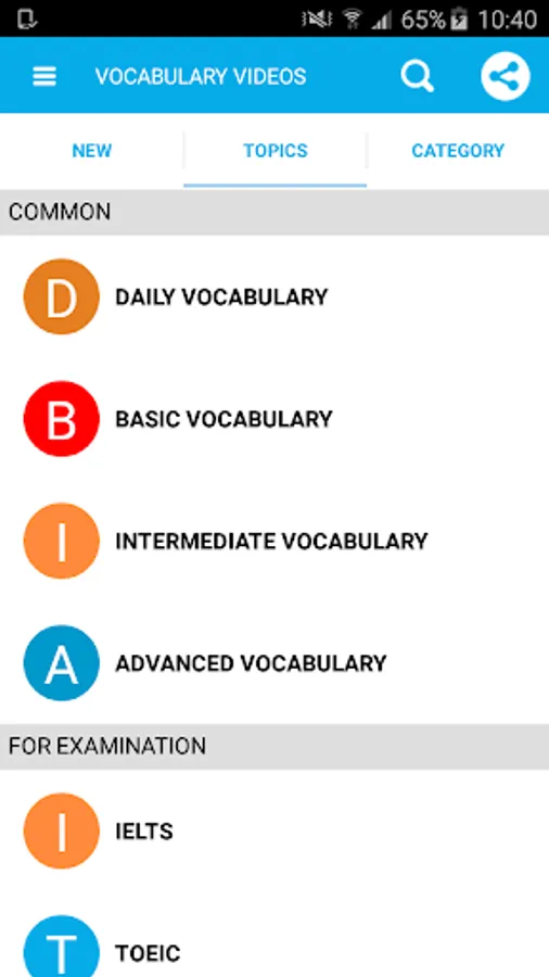 3. Learning vocabulary by common topics with many levels elementary, intermediate, advance.