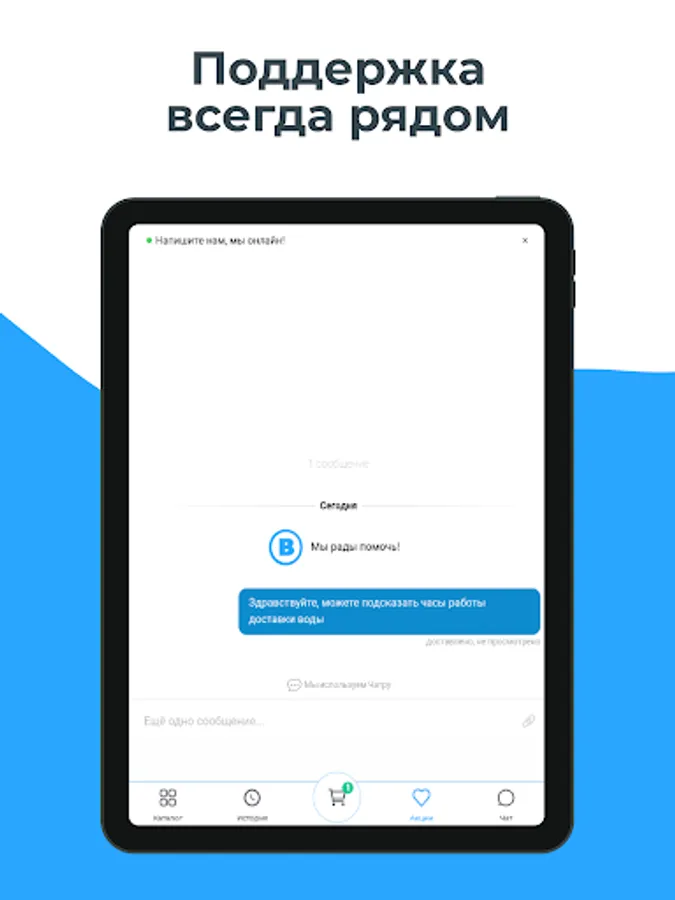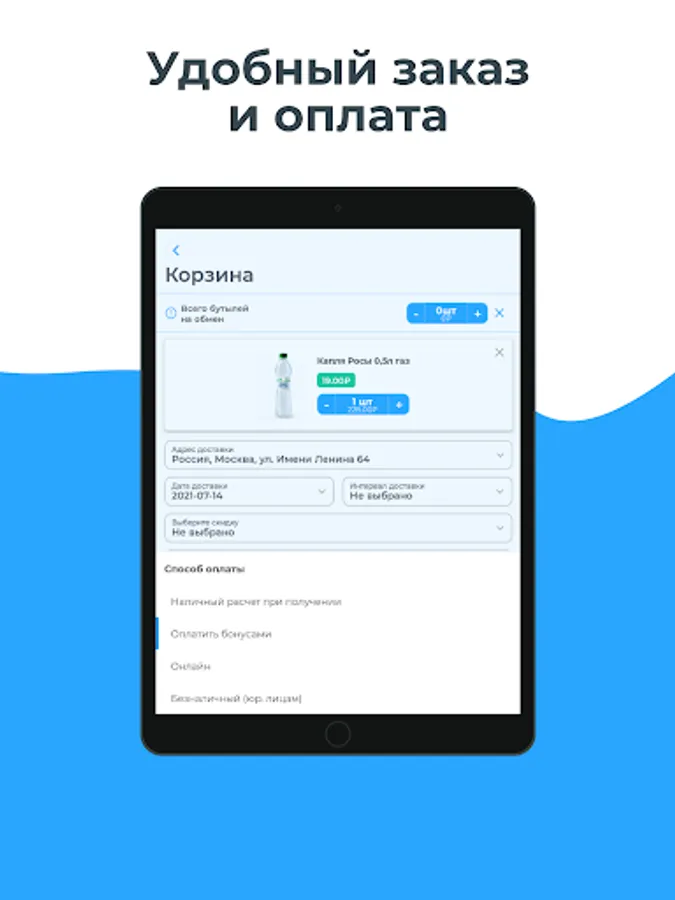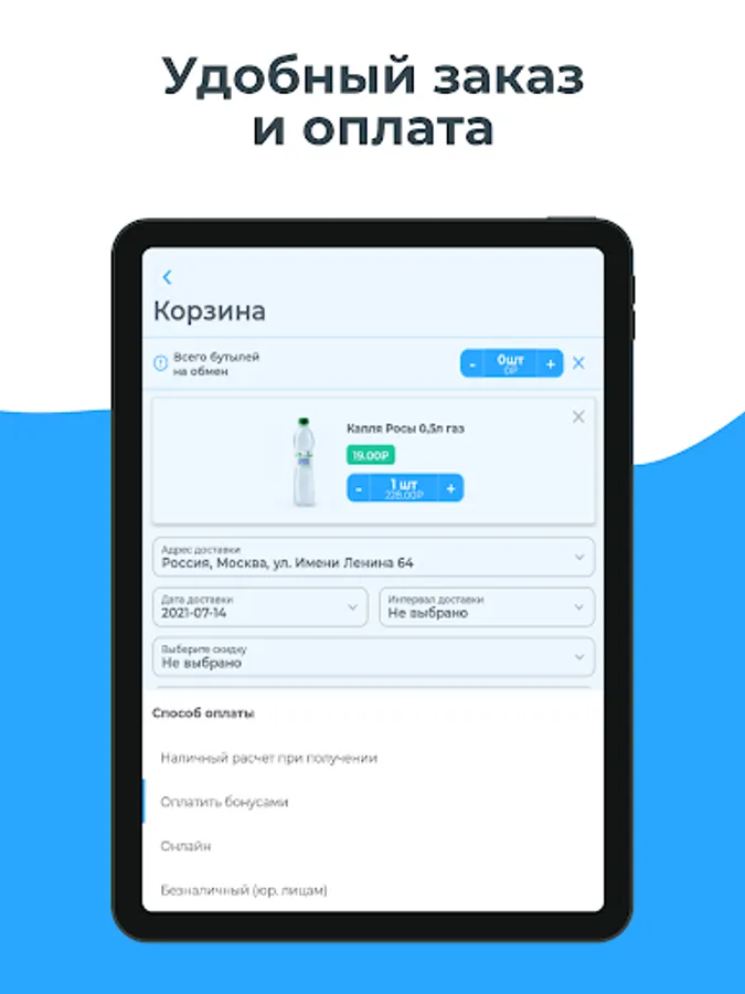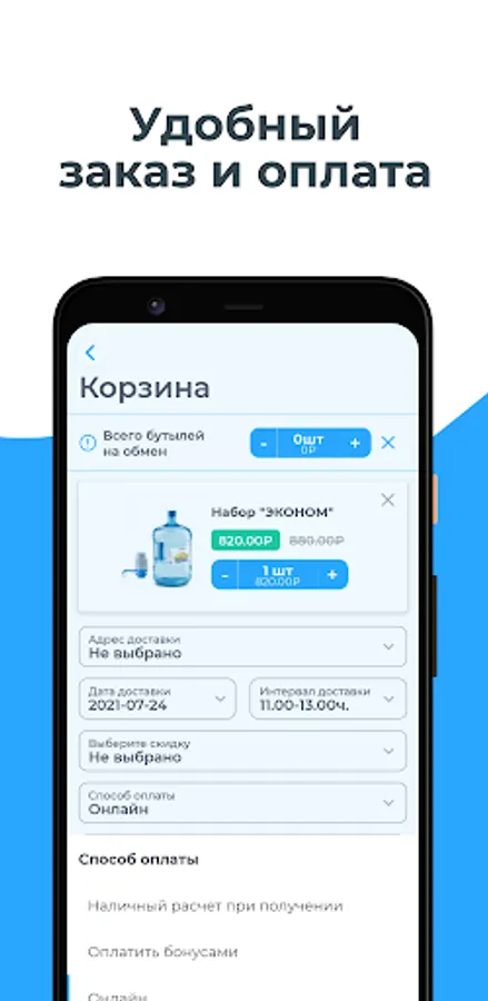 In addition to artesian water, the application also allows ordering coolers, pumps, soft drinks (lemonade, tea, coffee), as well as disposable tableware.