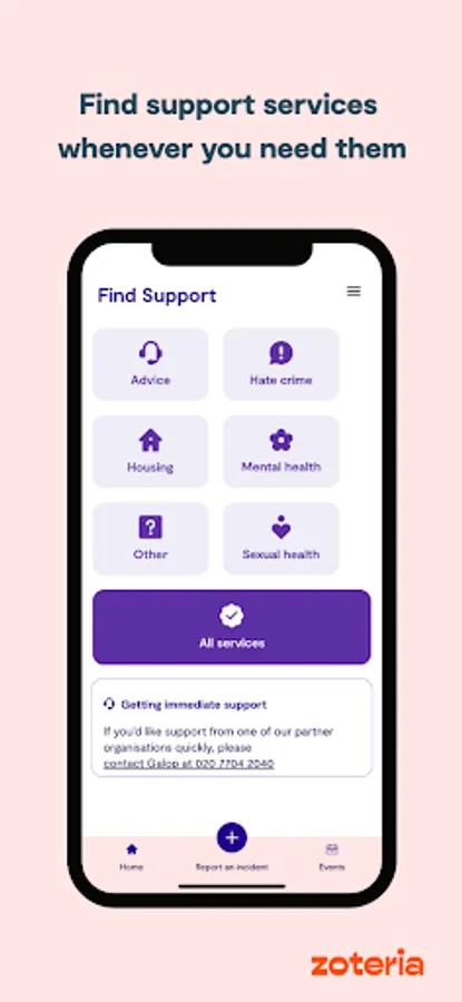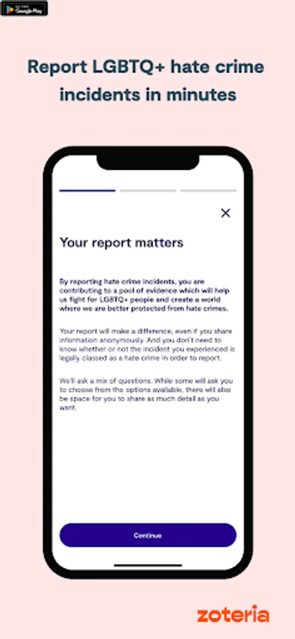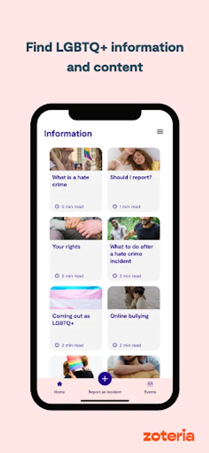 Zoteria promotes the safety and well-being of the LGBTQ+ community. Users can safely report a hate crime, gain access to relevant support services and LGBTQ+ information.