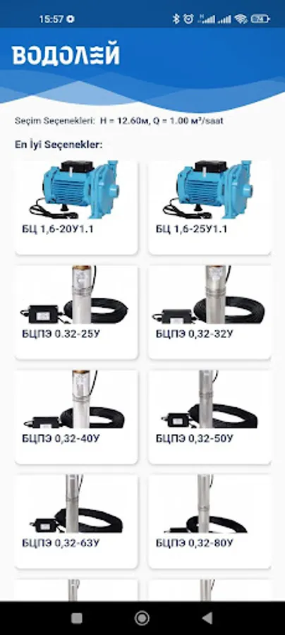 Vodoley Pump mobile application has been developed by the manufacturer factory. It is simple and understandable to use. It helps you to choose the right pump: it determines the pump suitable for your wishes according to the type, depth, pressure and amount of water of the water source and presents it to your choice.
