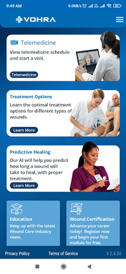 The latest version of the app includes a wound care predictive healing tool, recommended treatments, the latest wound care news, and a wound care certification course all-in-one. It also includes separate interfaces for Vohra's skilled wound care doctors to see patients virtually via telemedicine for our Vohra@Home program.