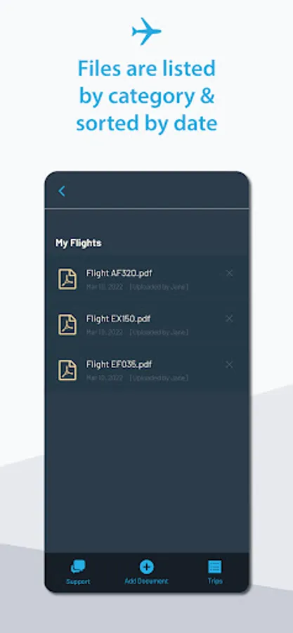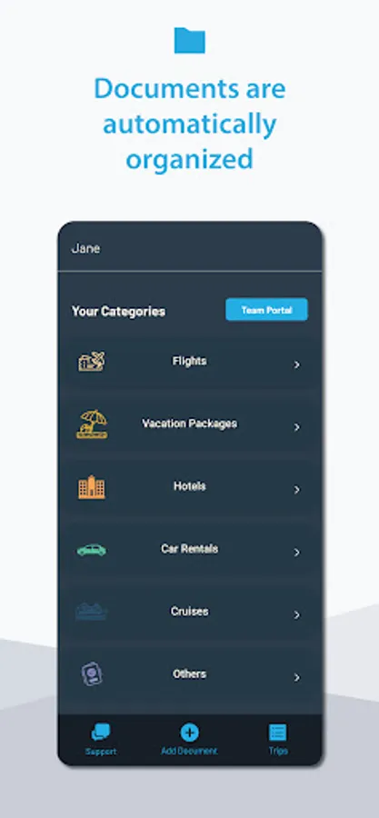 ■ Whether Flight reservations, Hotel reservations, Car rentals, Cruise bookings, or your travel itinerary, all documents are automatically categorized for quick access.