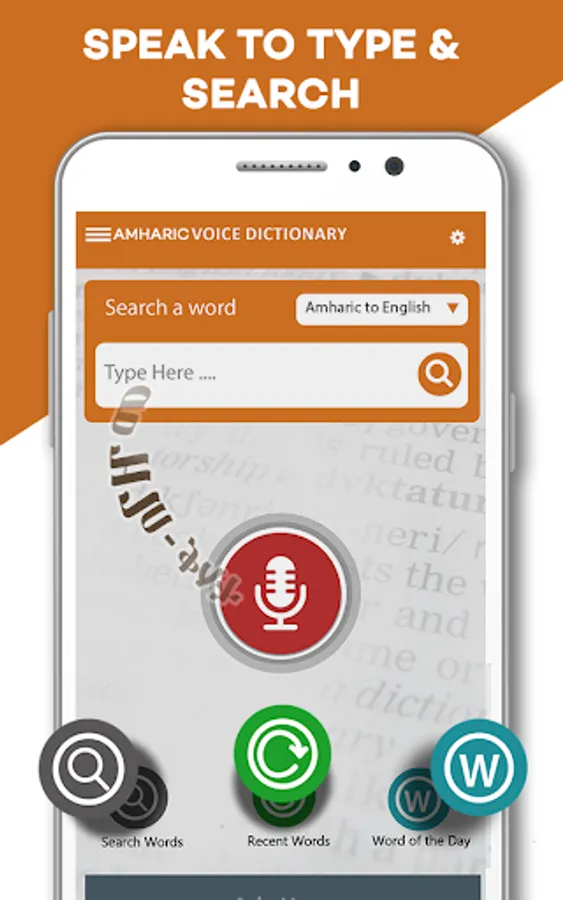 Amharic English voice dictionary has a huge data of Amharic and English words. You have two options to get the meaning from one language to another. If you type a single character, you will get all the words list which are starting from that letter. Another way is to simple speak a word of Amharic or English to translate in the other language.
