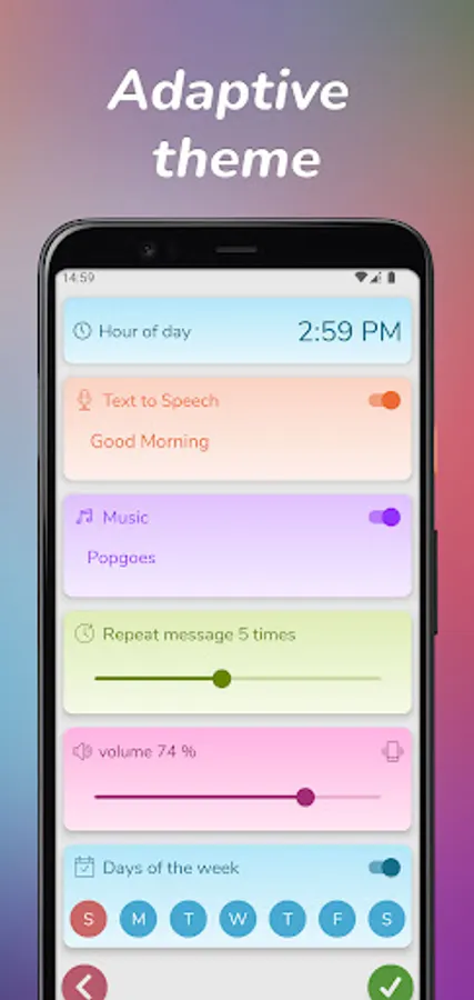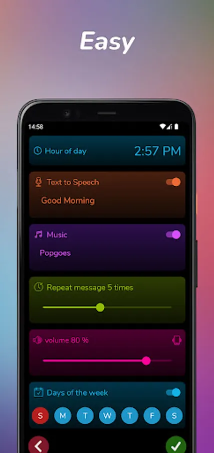 This app is designed to help people with disabilities get their bearings from events during the day. You create an alarm with a phrase, for example "Remedy time", then, at the set time, the app speaks the chosen phrase.