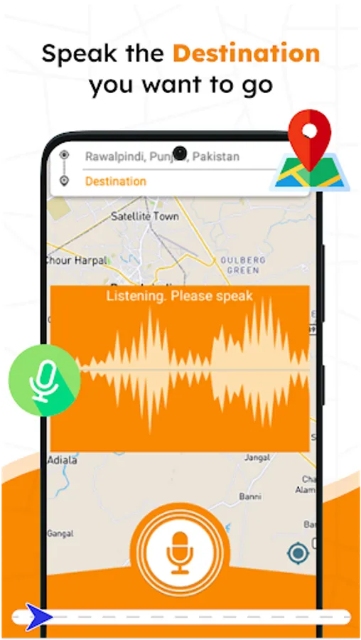 đ To find out routes with adequate distances with voice directions. Use voice command navigation to look for specific places, travel directions, pick and begin street traffic view be on road points and transport tab right away with voice enabled maps. With free earth maps, find directions from current to destination in navigation apps.