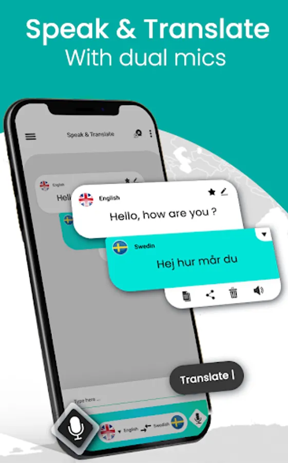 Speak & translate language translator app has a very simple conversation interface. The voice to voice translation feature allows you to listen translated text automatically, you don't have to tap on speaker buttons again and again. Simply tap on mic and speak in one language to get desired translation in other language and share the translated text to the people they want to communicate. One person talks, and second person get translated voice of that language, then second person talks and first person get translated audio using voice translator. It might be served as voice interpreter translator.