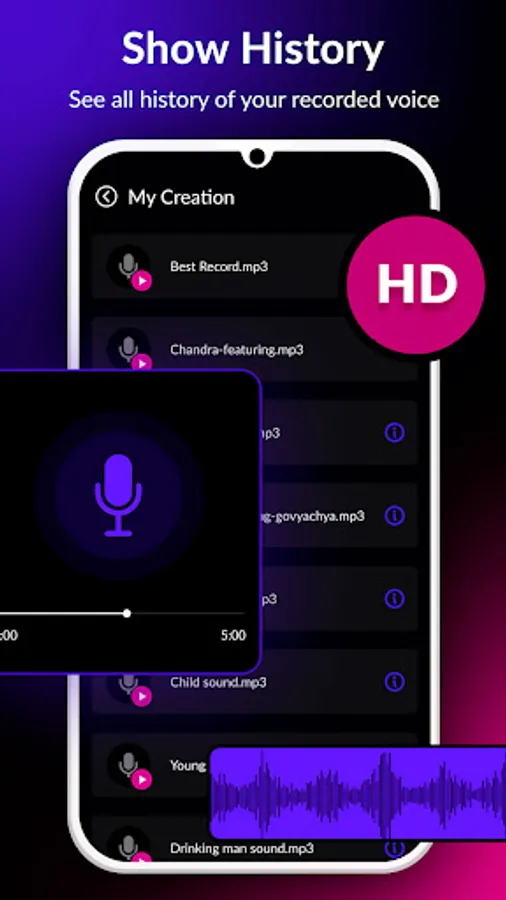 With the prank sound simulator, you can select an audio file for voice change. And voice changer AI would be processed on the selected audio file and voice modifier change the voice audio. The various sound effects can help to voice change for gaming steaming, prank call, and more.