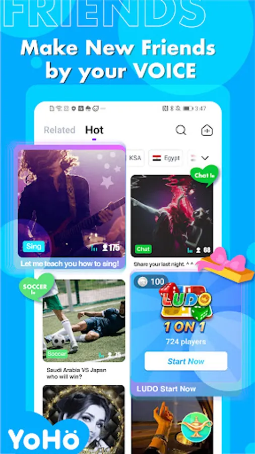 You can play multiple games while chatting in voice chat rooms. YoHo now has more games than ever. Like Ludo(لودو), Uno, and Dominoes(الدومينو), arcade fishing game, you name it! Have more fun with friends from all over the world.