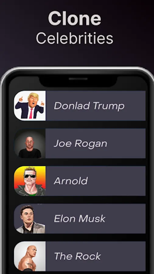 The app also offers a variety of premade voices. From realistic Al voices to famous characters and celebrities like movie stars, singers, politicians or movie characters.