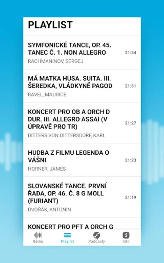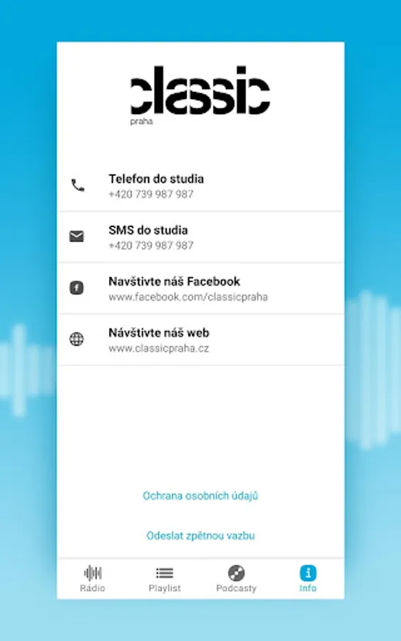 In the app you can listen to Classic Prague live, you will find here an overview of the songs played and important contacts directly to the studio.