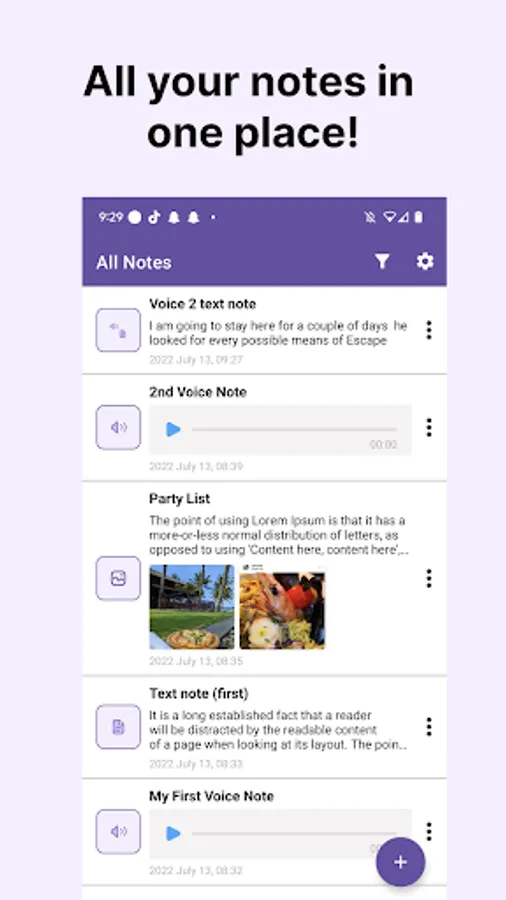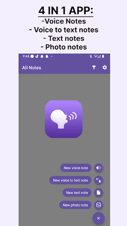 - All in One app: Voice notes, Voice to text notes, Text Notes (Notepad), Photos Notes.