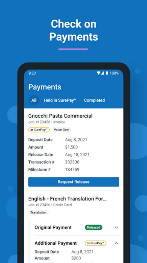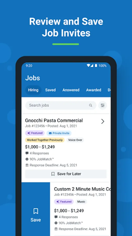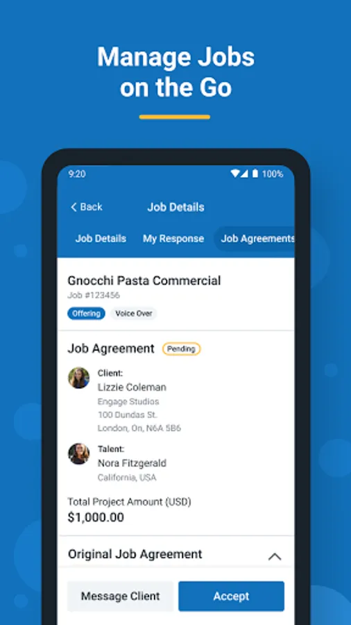 With our Voices Talent Companion app, you can easily manage jobs on the go, from saving jobs for later, to accepting job agreements, to communicating with clients, to checking on payment status for projects you’ve completed.