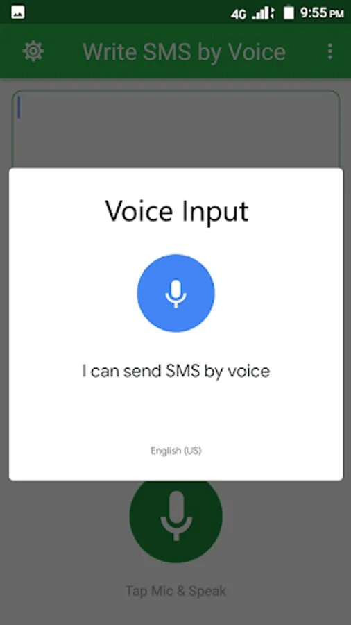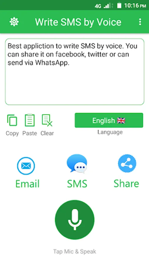 This app write SMS by voice is easy to learn by anyone. You will just express your words and this application Write SMS by voice app will automatically convert your voice/expression into SMS/text. Write SMS by voice app will quietly configure your voice into your desired SMS/text. Simply, Write SMS by voice application is simple and reliable and will be helpful for all ages of people.