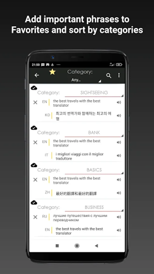 ► The possibility to sort and filter phrases in Favorites by category and language pairs