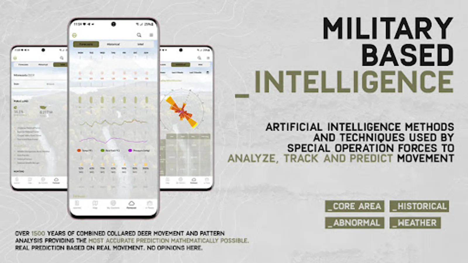 A.I. powered deer movement prediction with offline maps, historical weather, journal and statewide deer herd information.