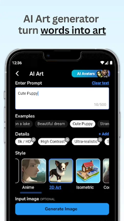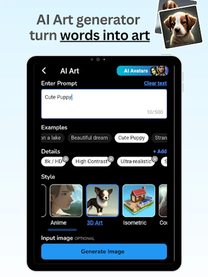 Create unique and beautiful artwork using AI. Just enter a prompt and pick your preferred style then let AI Art Generator amazes you with an unpredictable AI-powered painting art in seconds.