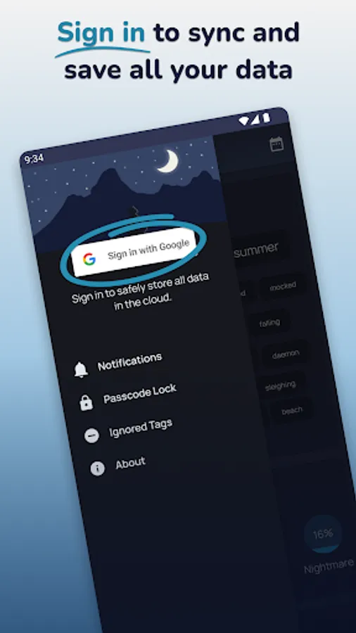 Log in with Google to always keep your dreams safe and secure in the cloud. Log in to as many devices as you want and all your dreams will stay in sync.