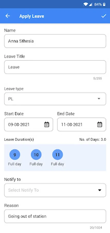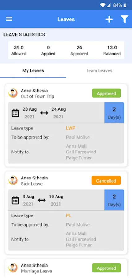 • Notifications for leave application, approve leave, reject leave, cancel leave and notify leave