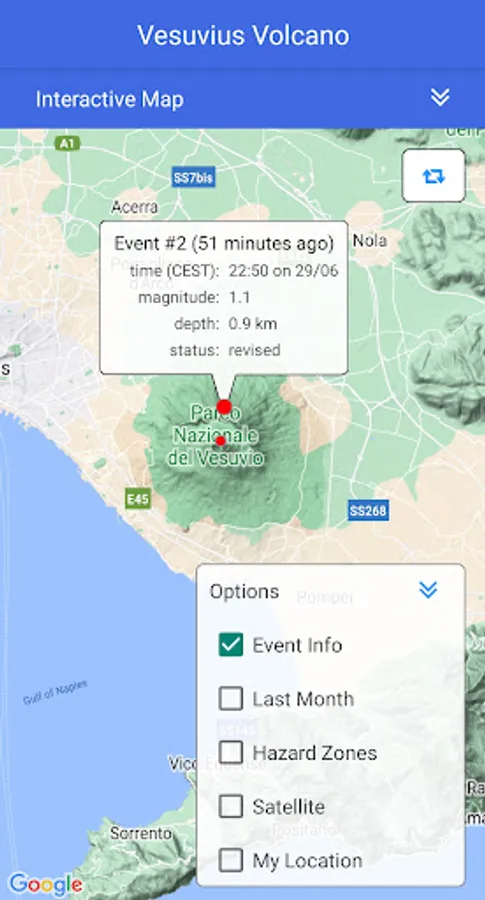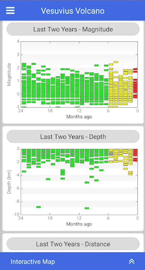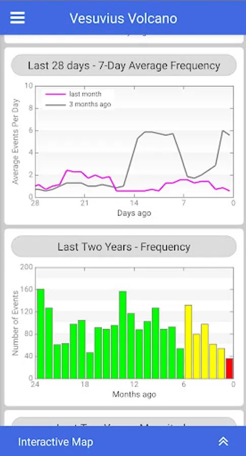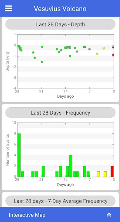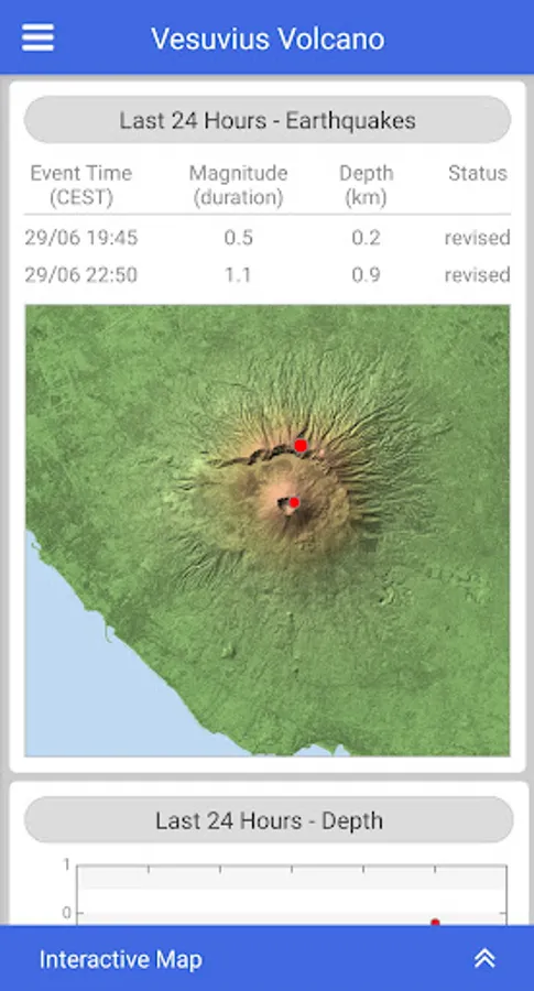 The earthquake data are obtained by the Vesuvius Observatory of Italy's National Institute of Geophysics and Volcanology (INGV-OV). The app regularly downloads these data and creates time-series graphs showing trends in earthquake frequency, magnitude and depth. Epicentres are also plotted on an interactive map together with maps of the official hazard zones and your location if you are in the area.
