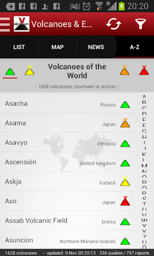 - Complete volcano listing worldwide alphabetically/by country/by activity level (starting from v. 1.4.0)