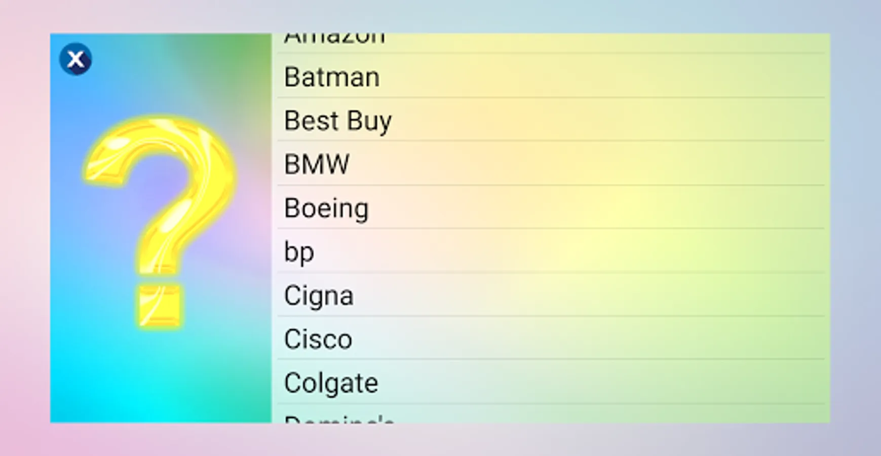Logos shown in the game are copyright and/or trademark of their respective corporations. The use of low-resolution images in this trivia app is for identification in an informational context and qualifies as fair use under copyright law.
