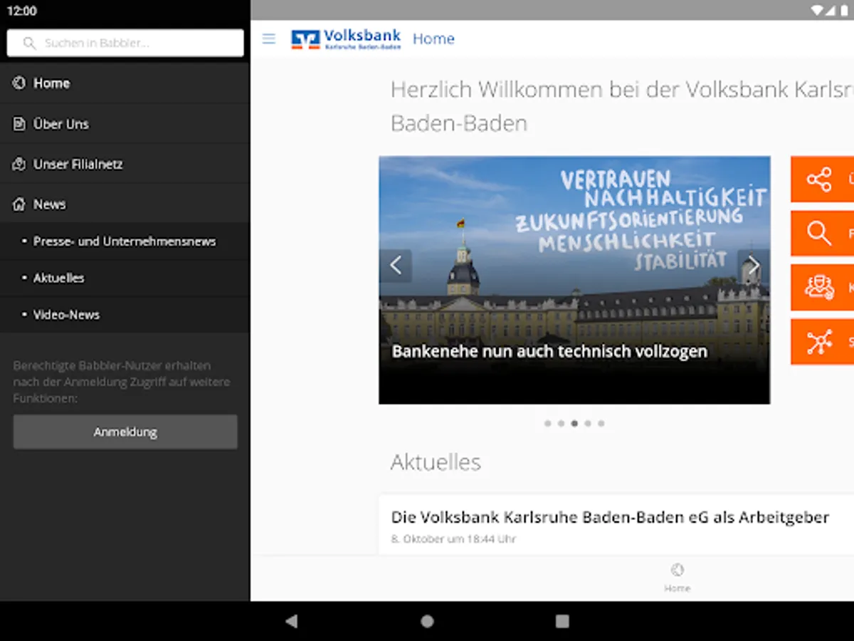 Welcome to the communication platform of Volksbank Karlsruhe Baden-Baden eG. With our app "Babbler" we offer you an insight into exciting career opportunities, news about us and our region as well as modern products and services.