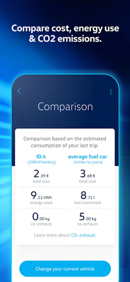 You can now compare all of the information on the journeys you have taken with a Volkswagen electric car of your choice. This will show you whether you could also have made all your journeys in an EV (electric vehicle). And above all: how much energy, CO2 and costs you would have saved as a result. You can also get a recommendation on the electric car that best fits your "mobility profile".