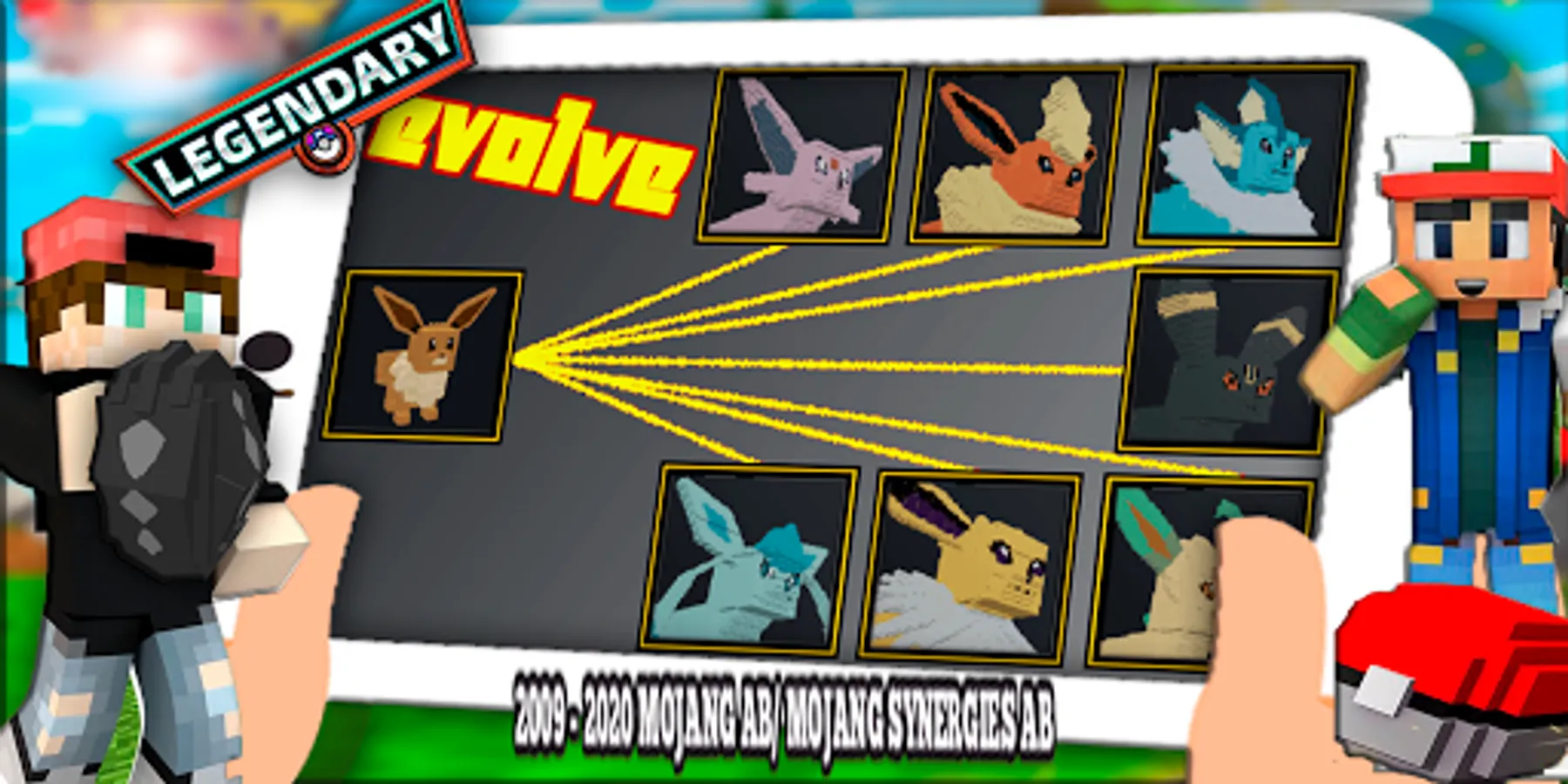 Welcome to the Pocket pixelmon mods for mcpe and Pokecraft monsters mod & skins. One click use! Easy to use app with manual for kids, contains Poke Monsters Plush Collection mod, Pika and Eevee Monsters Evolution map, Kalos Legendary Pixelmon addon for mcpe.