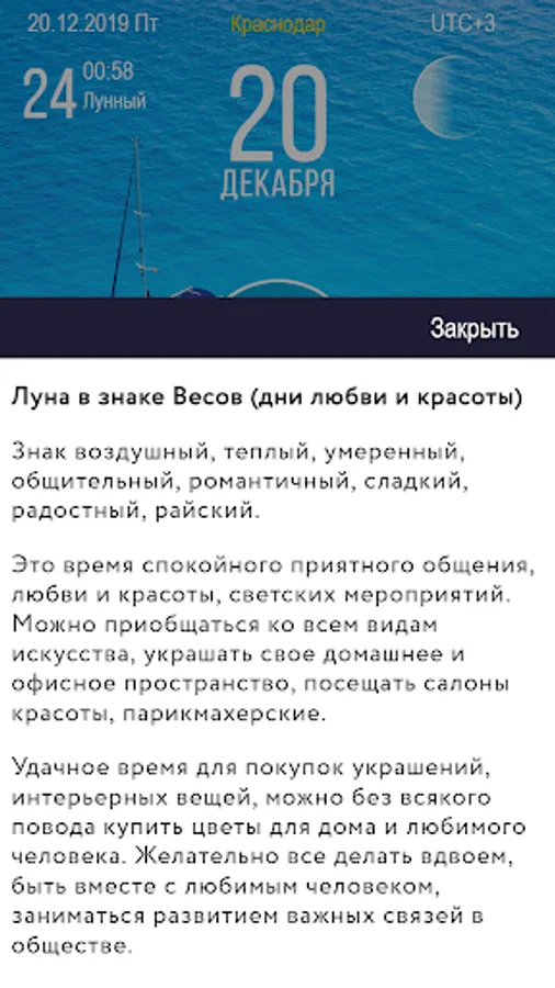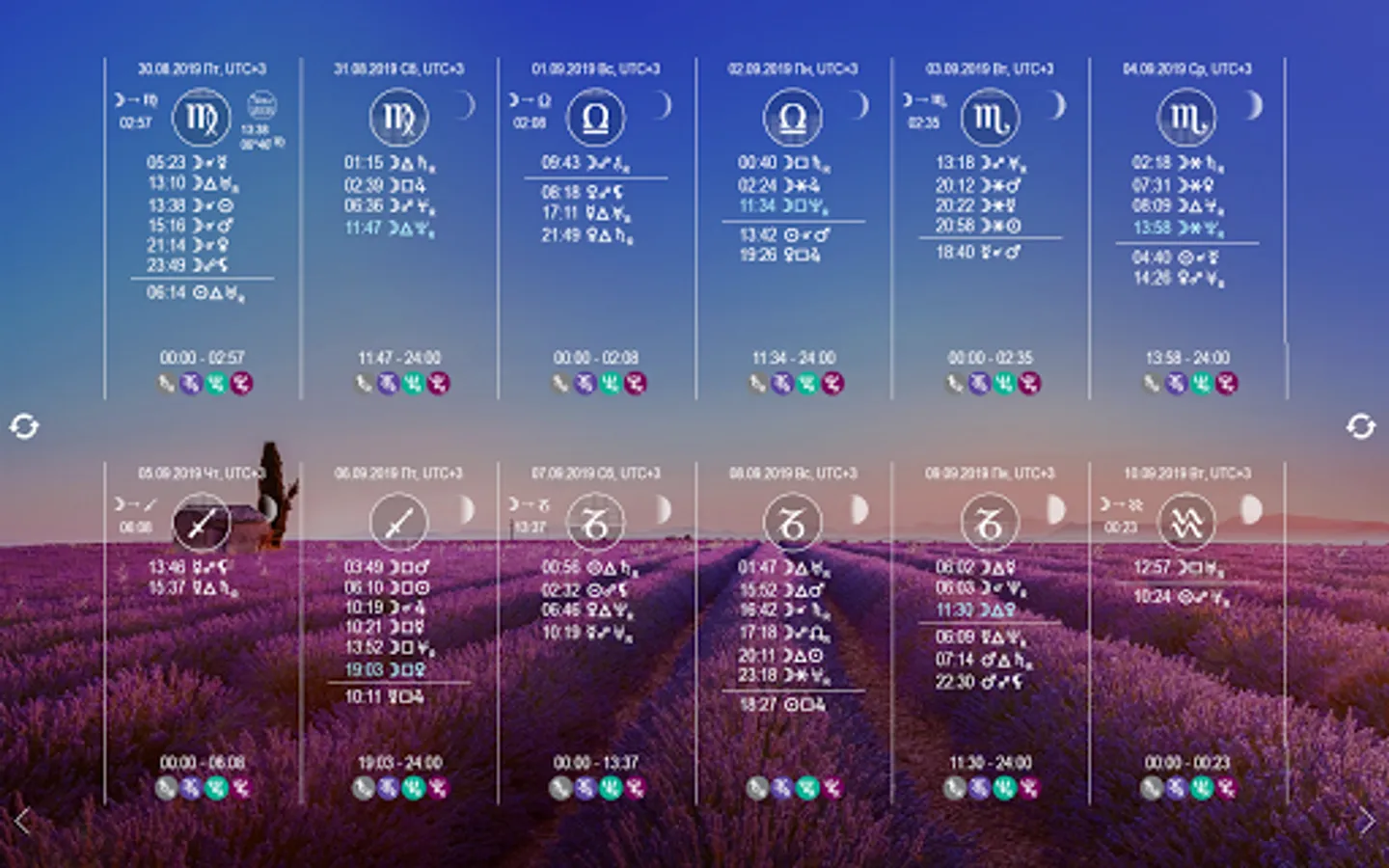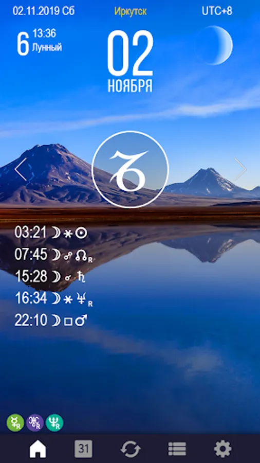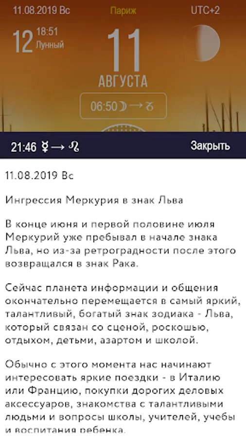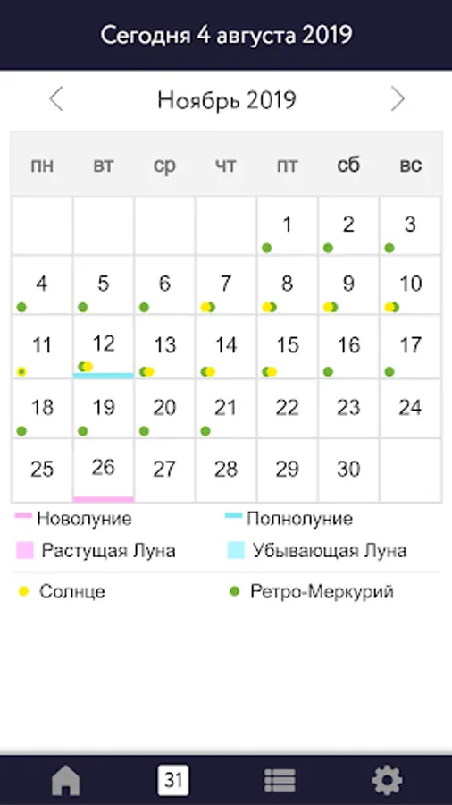 The peculiarity of the astrological calendar Sky Calendar 2019 is the instantaneous reading of information, beautiful design decisions, the high professional level of all the information presented, interpretations and calculations.