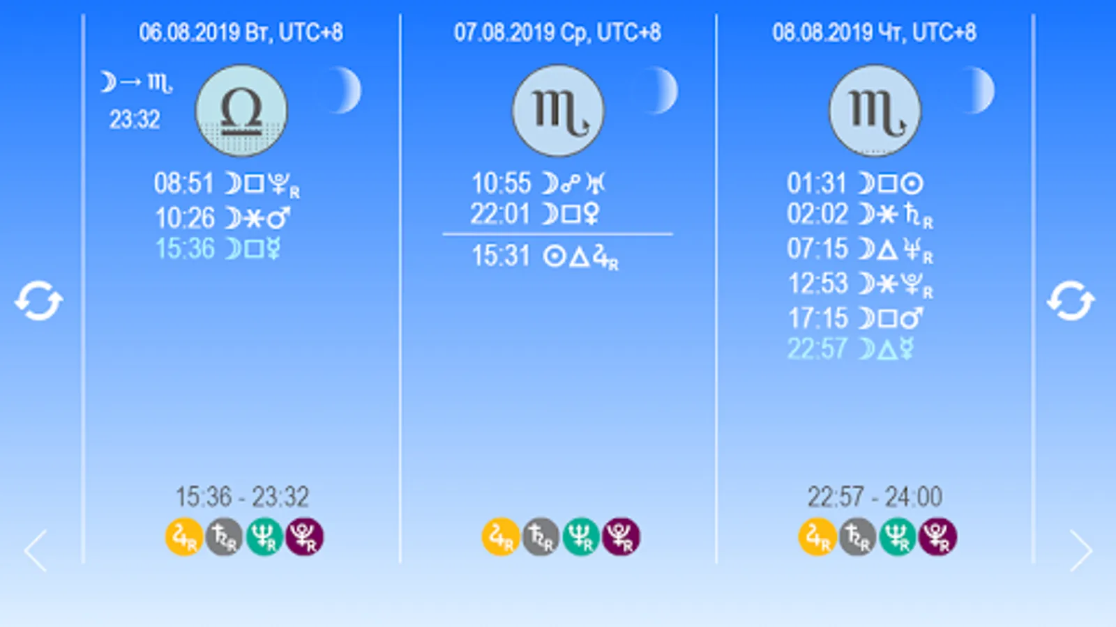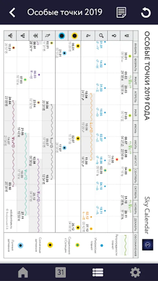 The application contains a unique table of Special Points, which contains all the important major events of the year - the ingressions and retrograde of the planets, the eclipse of the Moon and the Sun, all aspects of the Sun with planets for 2019.