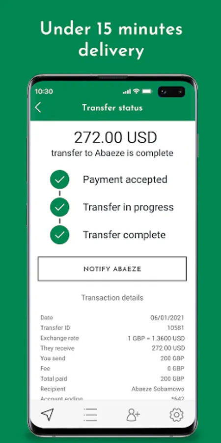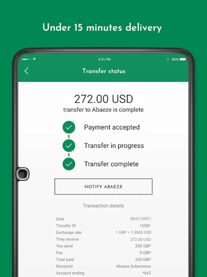 - Instant transfer notifications. Keep track of your money with instant status updates about your transfer.