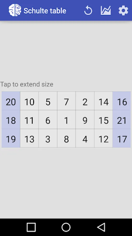 Schulte table offer size of table from 3x3 to 7x7 with variation 3x5, 3x7 up to 11x11