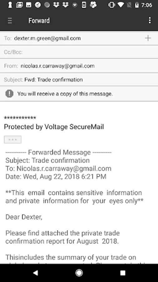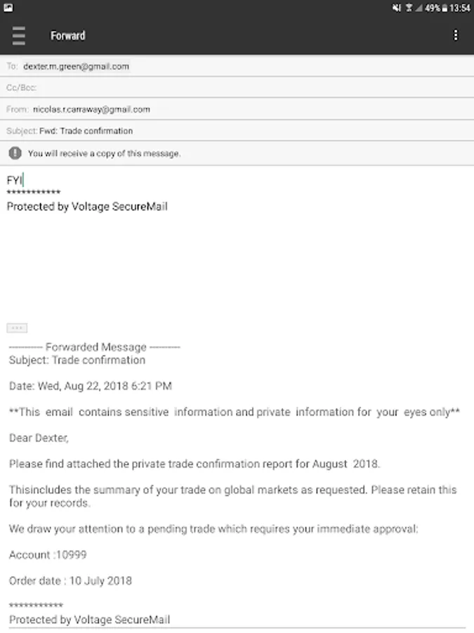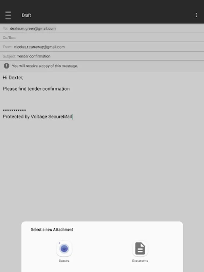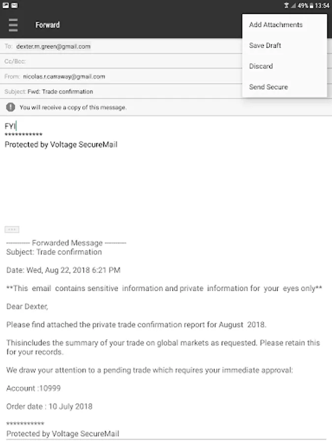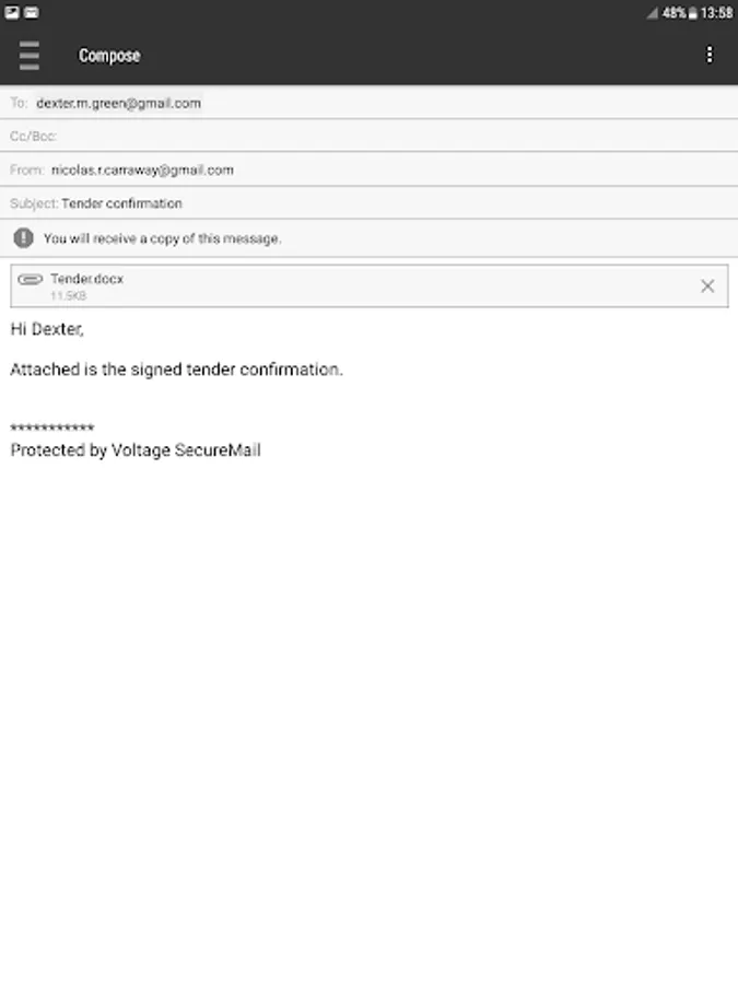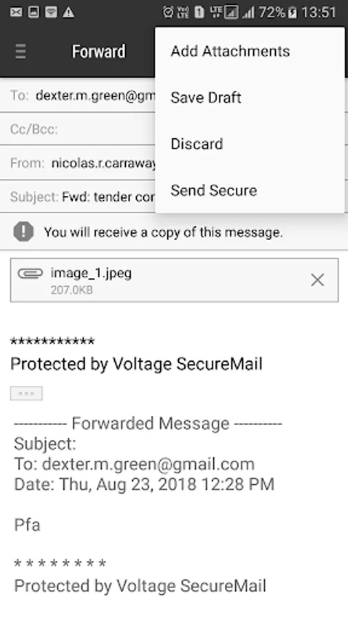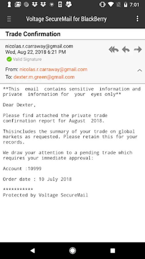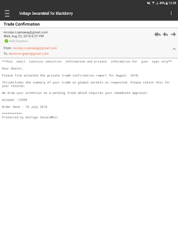 • BYOD support - Uses regular Voltage SecureMail workflows to encrypt and decrypt emails outside the BlackBerry Dynamics environment, such as decrypting an eStatement received in Gmail on a BlackBerry Dynamics enabled work phone