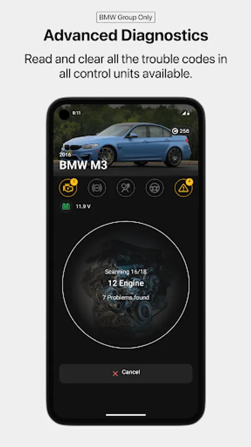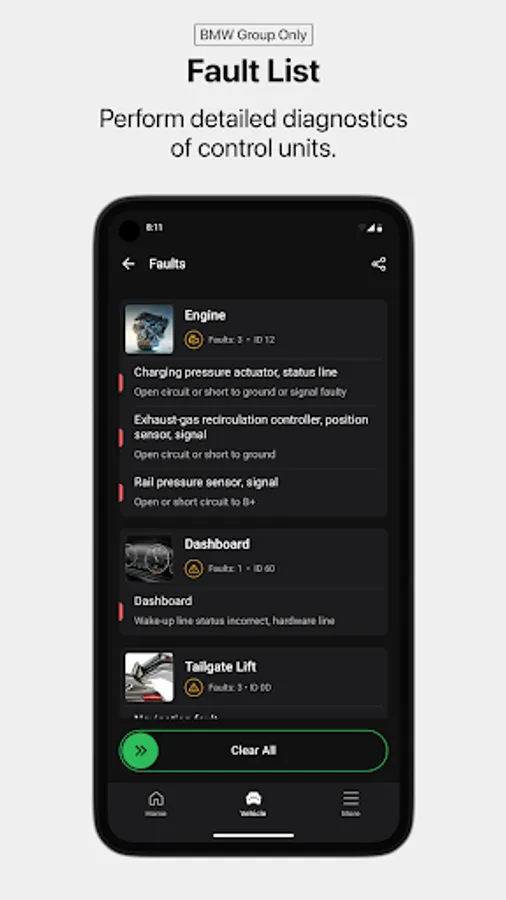 Currently, the OBDeleven app offers separate functionalities for different car brands. All car brand owners can run engine diagnostics, get detailed fault codes and identify key faults. BMW Group drivers can also run Advanced Diagnostics, receive accurate fault codes, clear non-relevant issues, and customize your vehicle's features.
