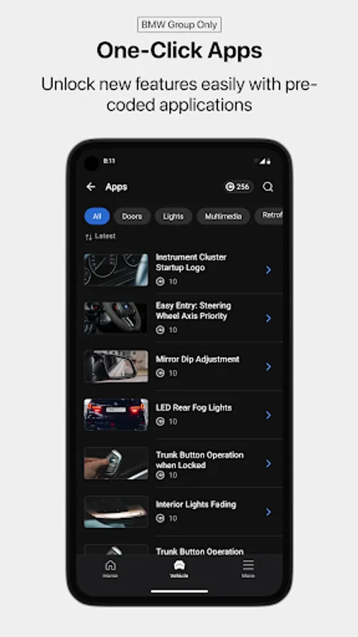 We did the coding for you! Activate or deactivate car functions using ready-made coding applications for everyone. Choose from an extensive library of thousands of One-Click Apps for different car models. Purchase your favorite One-Click Apps with Credits, our in-app currency.