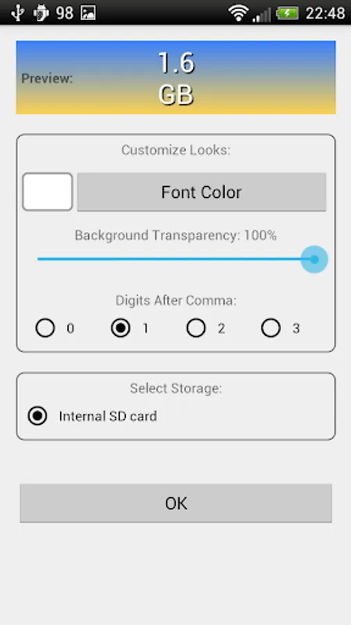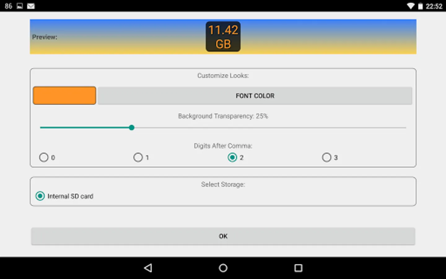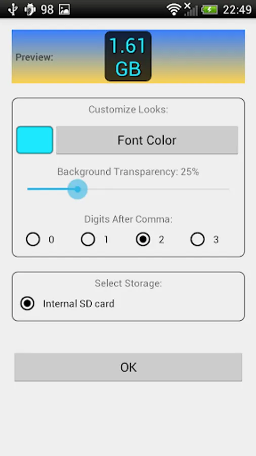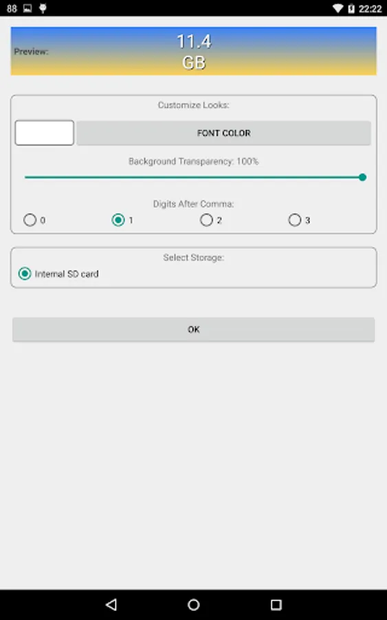 This app provides a widget that shows free space on selected storage (e.g. SD Card). The value is displayed as plain number. You can customize font color and background transparency.