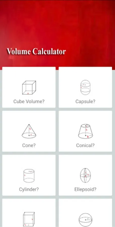 The volume of a cube, cube, cone, cylinder, sphere, triangular prism, pyramid, rectangular base, cone bottom, capsule, rectangular can all be calculated using this volume calculator app.