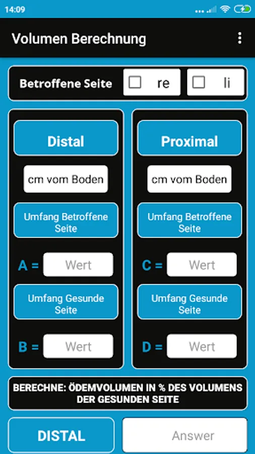 - Der Umfang wird mit dem Messband gemessen . Dies wird am ödematösen Bein und am gesunden Bein gemessen und entsprechend in die App eingetragen. Es wird ein distaler und ein proximaler Umfang gewählt.