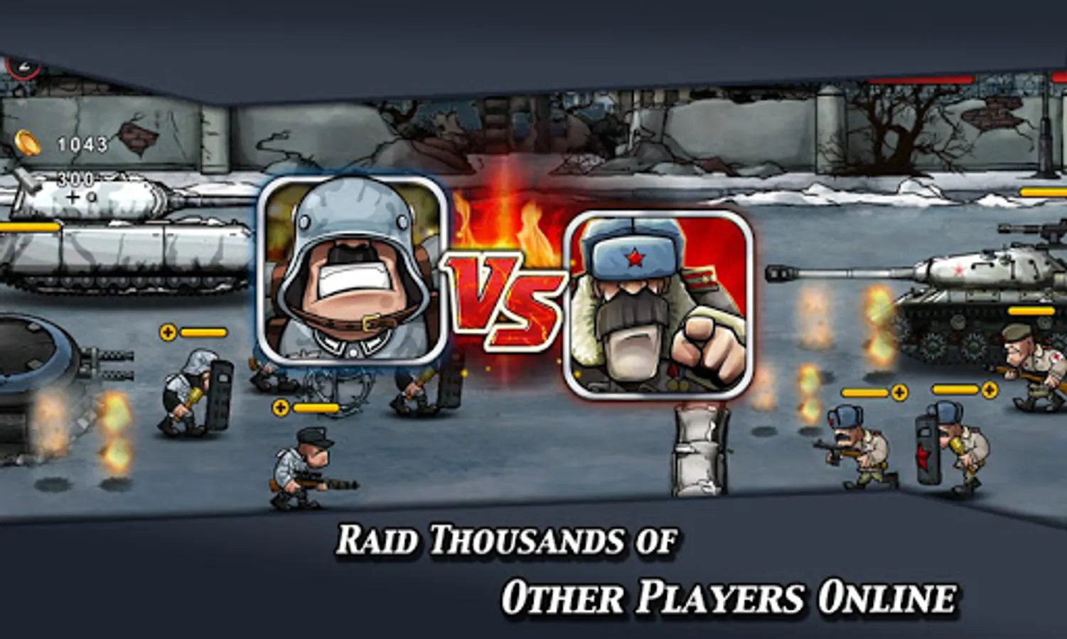 Choose a side (Silver Fox or North Polar)—and then assemble troops and resources in order to take over enemy bases of increasing difficulty. Train your troops (riflemen, sharpshooters, medics, grenadiers, and more); build armor units (armored cars, light/heavy tanks); summon air support (air superiority fighters, bombers); and establish outposts on enemy territory to generate indispensable iron and gold—the key resources for expanding and upgrading your army.