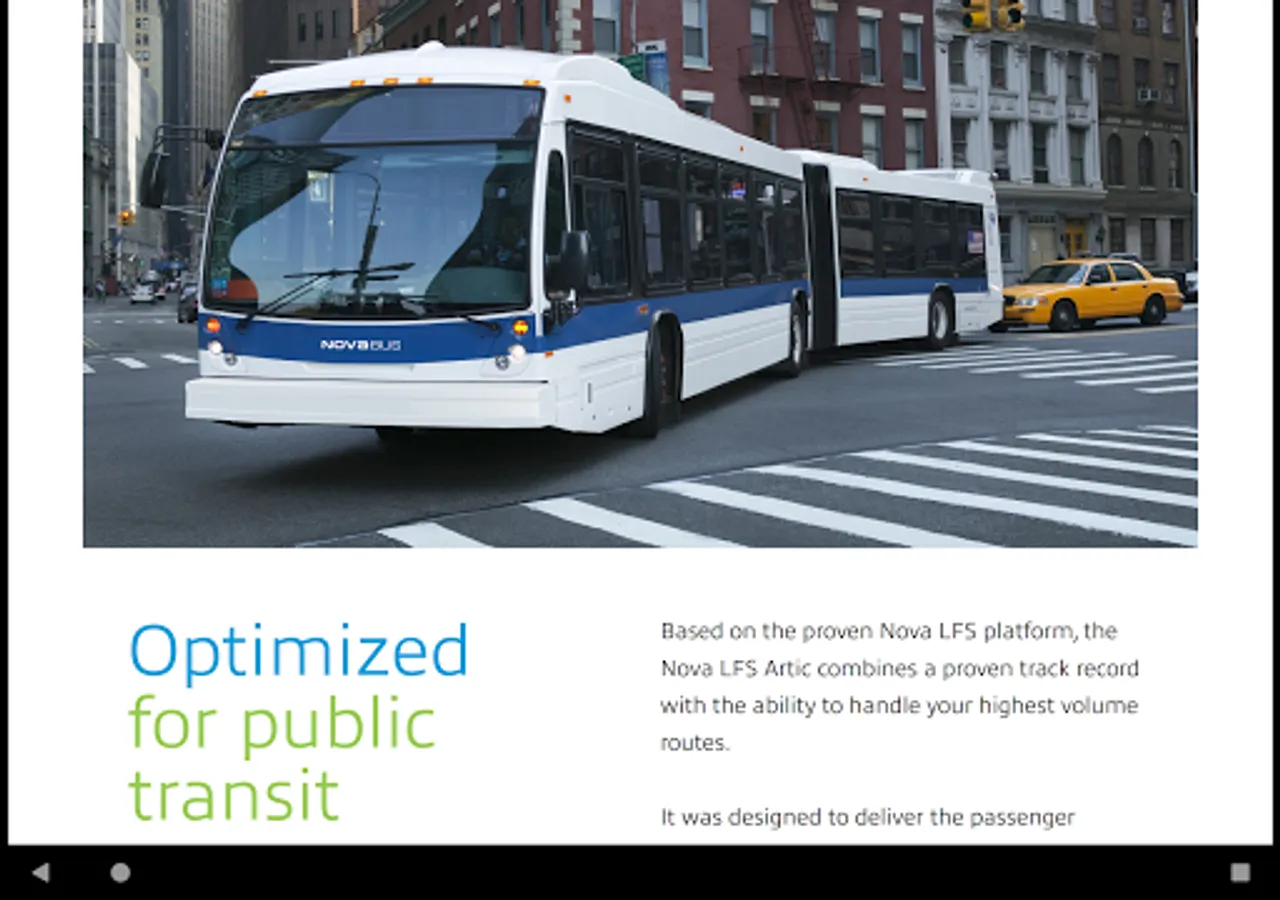 Nova Bus MarCom Digital Portfolio is an application designed for use by Nova Bus sales representative and authorized internal users only. The MarCom Digital Portfolio is a “mobile suitcase” containing marketing and communication material, digital content, corporate news and more. Contents are applicable for the US and Canada only.