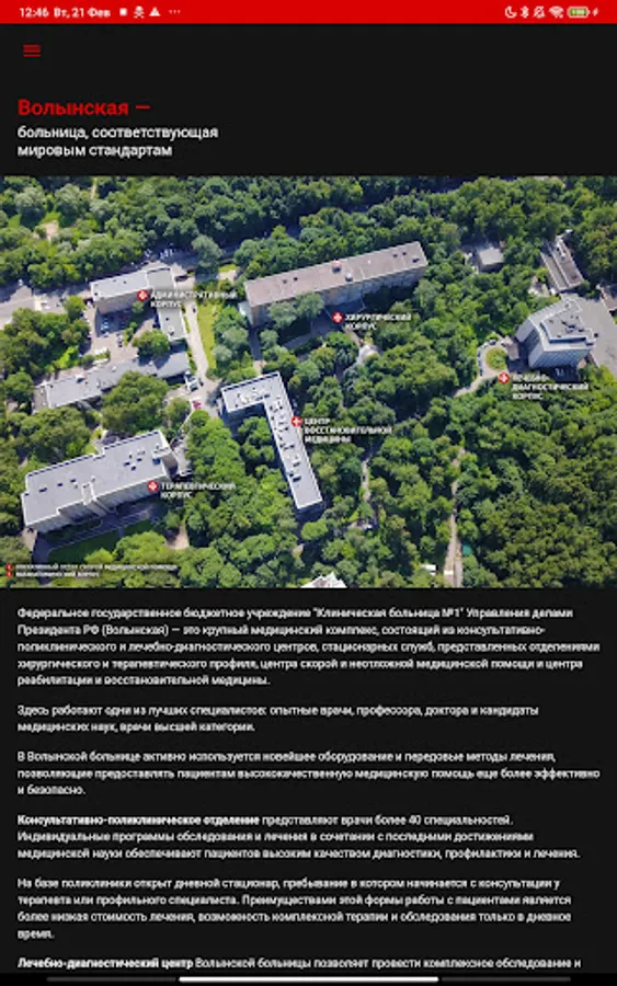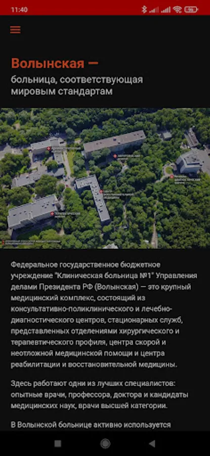 Federal State Budgetary Institution "Clinical Hospital No. 1" of the Office of the President of the Russian Federation (Volynskaya) is a large multidisciplinary medical complex that meets international standards. More than forty outpatient clinics, more than twenty inpatient surgical and therapeutic departments, as well as a modern diagnostic and treatment center are at your service.