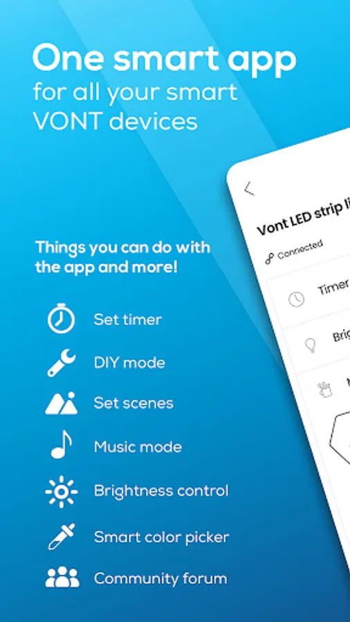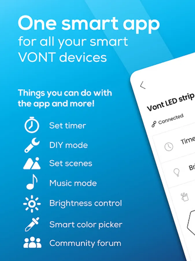The app houses all the commands for your Vont smart home devices. When synced in, it maximizes the products’ features, so you can enjoy all the good stuff. Change the brightness, set the timer, and play with the 16 million colors available on the Strip Light and Smart Bulb. Plus other fun automation you can do with just a few taps in the Vont Home app.